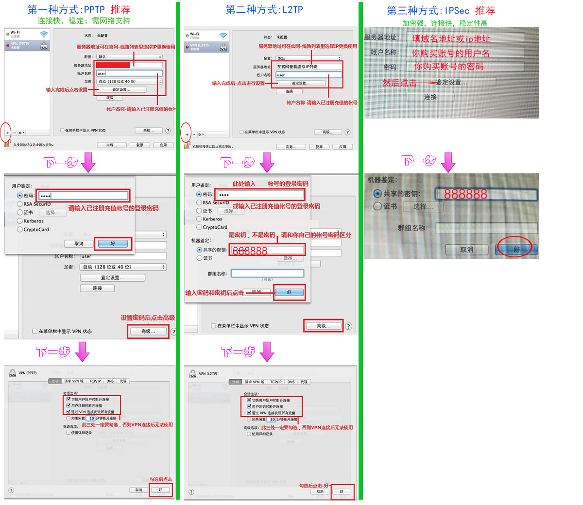 如PPTP方式连接不了,请尝试用L2TP预共享密钥方式,密钥都是888888