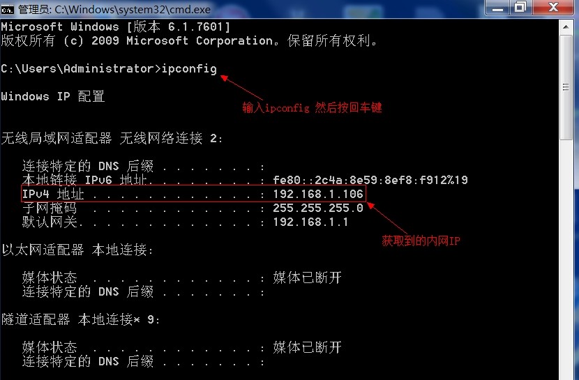 第二步:在黑色背景DOS窗口输入ipconfig然后回车,获取主机的IP地址
