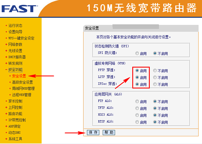 进入界面后---安全设置---里面SPI防火墙选择不启用;设置PPTP、L2TP都选择启用